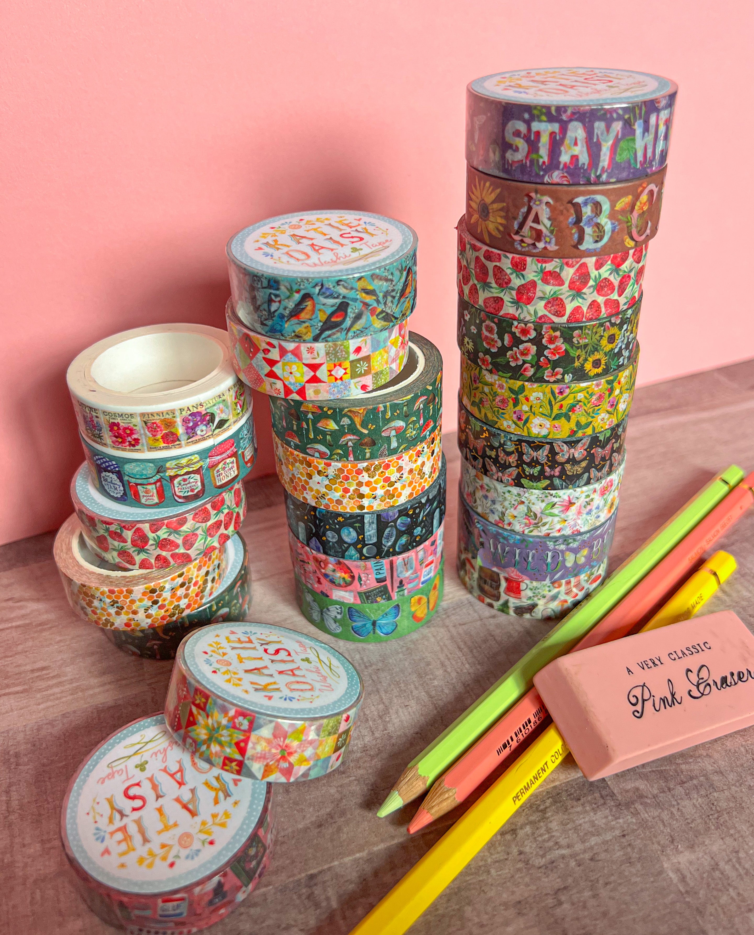 Katie’s studio is a kaleidoscope of color and light: jars of paint, brushes, and wild blooms gathered from her garden. Each shade she mixes carries notes of the natural world, translating meadow hues and morning skies into paint and paper.